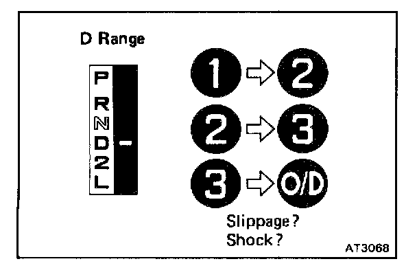 d. While running in the D range, 2nd, 3rd and O/D gears, check to see that the possible kick-down vehicle speed limits for 2->1, 3->2 and O/D->3 kick-downs conform to those indicated on the automatic shift schedule.