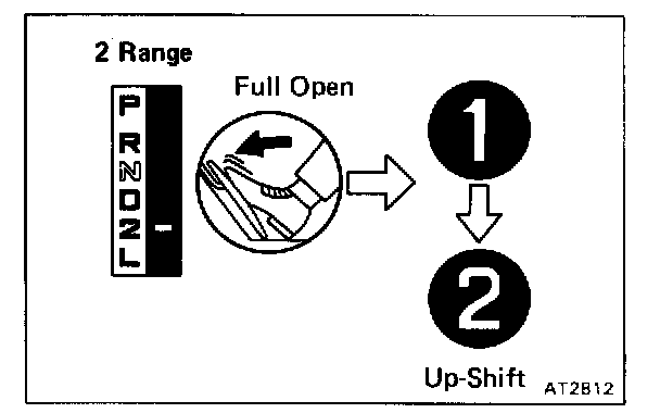 Shift into the 2 range and, while driving with the accelerator pedal held constantly at the full throttle valve opening position, push in one of the pattern selectors and check on the following points.