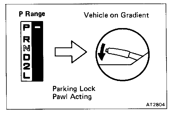 Stop the vehicle on a gradient (more than 5°) and after shifting into the P range, release the parking brake. Then check to see that the parking lock pawl holds the vehicle in place.