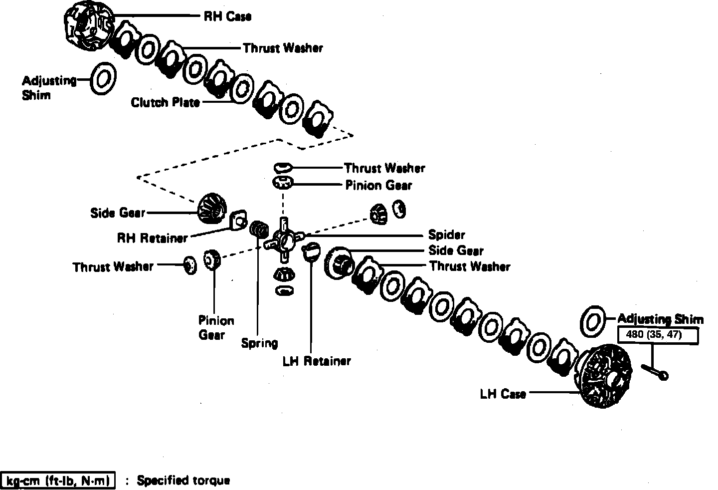 4. From righthand case, remove lefthand retainer, spring, spider with pinion gear, righthand retainer, side gear, 5 side gear thrust washers and 4 clutch plates. Keep disassembled parts in order they were removed.