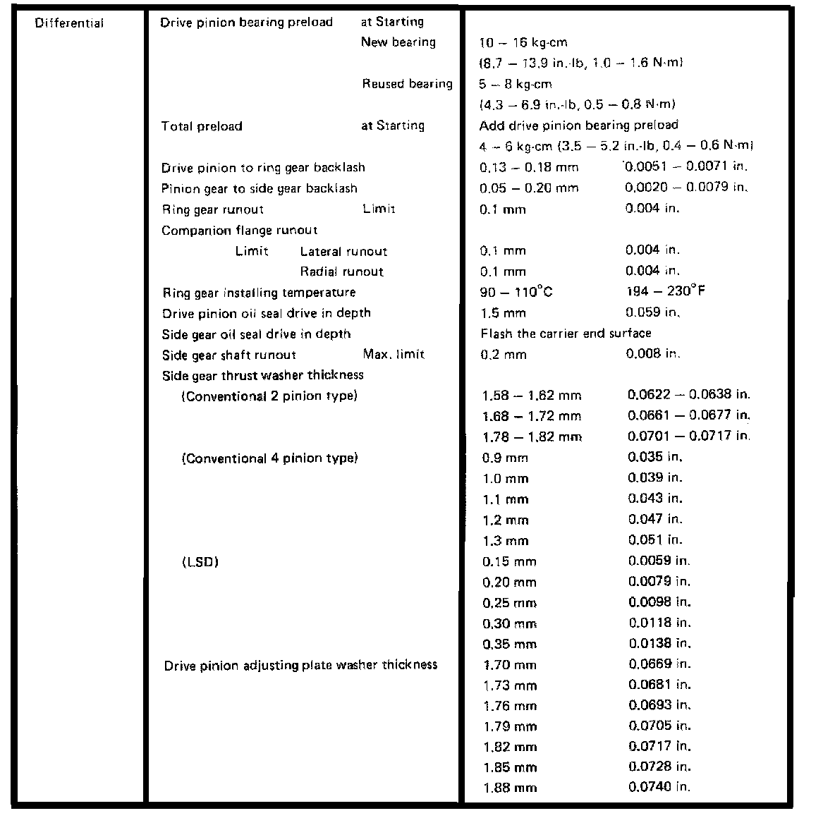 Rear Differential, Pinion Preload/Side Gear Thickness: