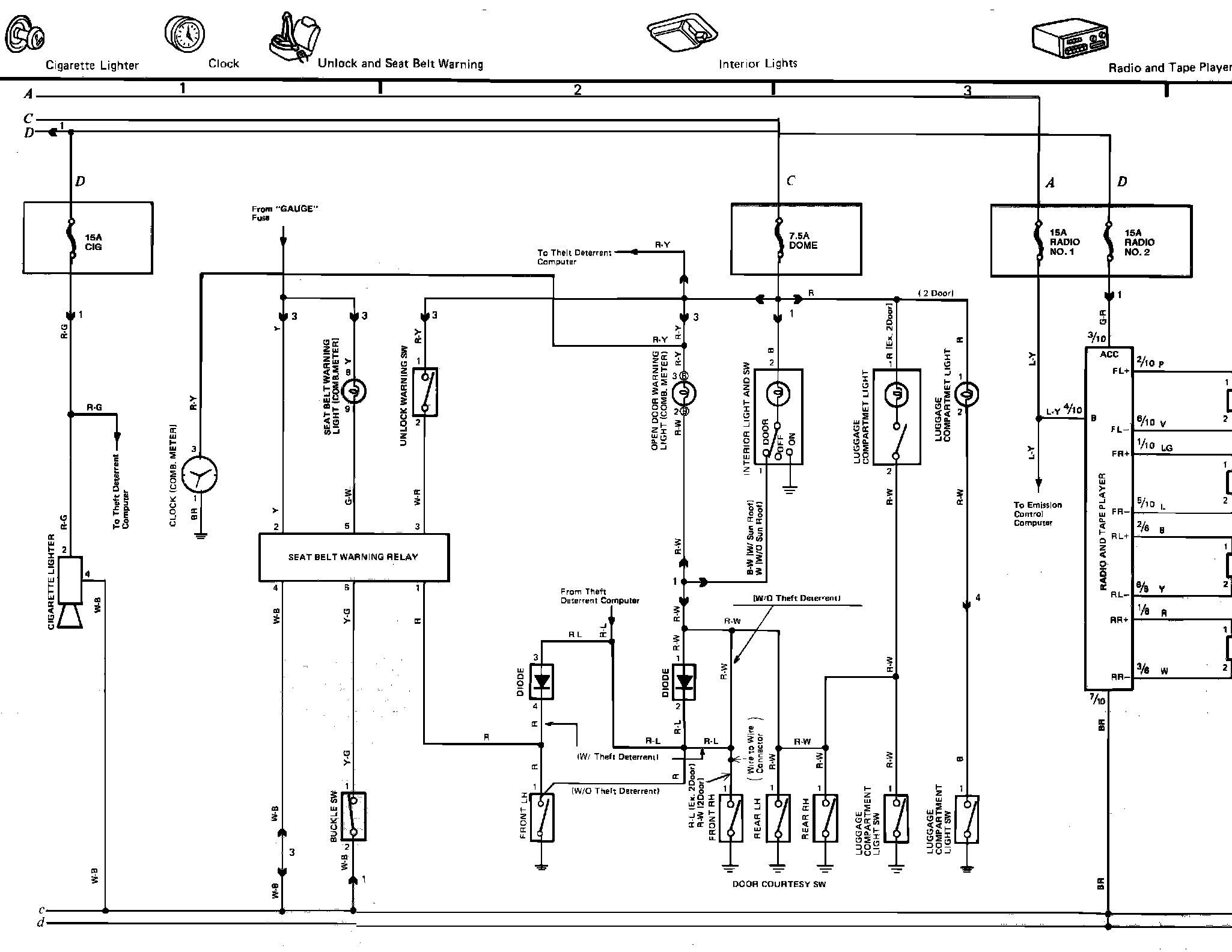 7�Cigarette Lighter, Clock, Seat Belt Warning, Interior Lights, Radio/Tape Player And Emission Control (California) Wiring Circuits: