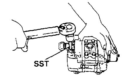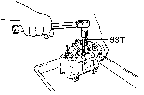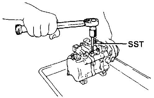 (b) Install the service valves on the compressor. Using a torque wrench and SST, tighten the bolts. SST 07110-61050