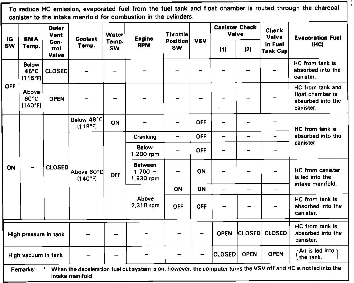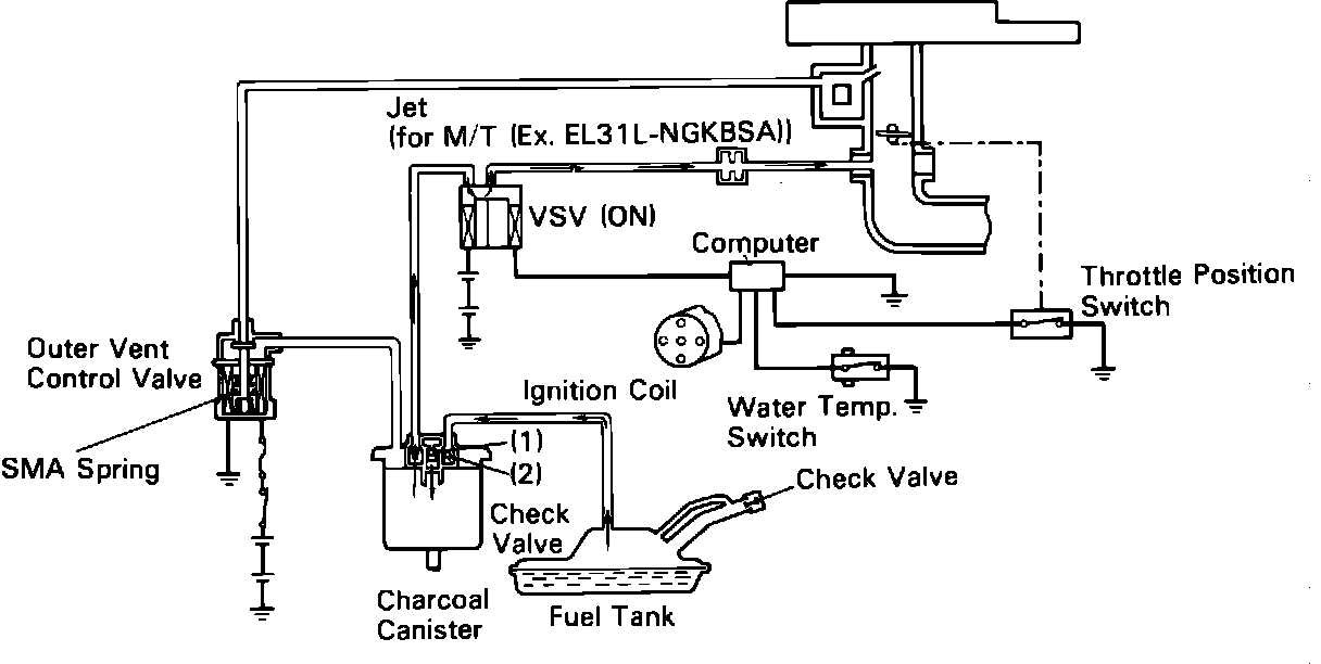 This system is designed to minimize the amount of raw fuel vapors escaping into the atmosphere, and consists of a charcoal canister, an outer vent control valve, an electronic control unit (ECU) controlled vacuum switching valve (VSV) and fuel tank filler cap with a check valve. The system uses the charcoal canister to store fuel vapor when the engine is not running. When the ignition is turned off, the outer vent control valve is opened allowing vapor to vent into the charcoal canister. The ECU monitors engine speed, throttle position, water temperature and opens the VSV when the conditions are correct for purging of the charcoal canister and fuel tank. The check valve in the fuel cap allows air to enter the tank, thus preventing tank deformation and allowing clean air to sweep through the tank.