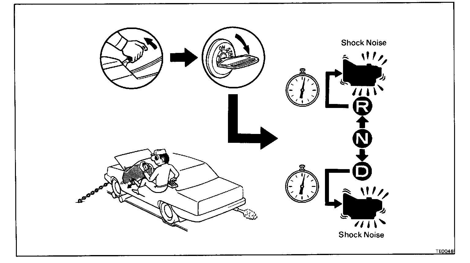 c. Shift the shift lever from N to D range. Using a stop watch, measure the time it takes from shifting the lever until the shock is felt.