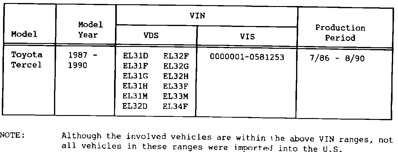 Toyota will initiate a Special Service Campaign to inform certain Tercel owners of the need to use only Koito brand replacement headlamp bulbs. The original equipment headlamp bulbs in these vehicles were all Koito brand. The use of any brand of bulb other than Koito can cause the headlamp to fail to meet all of the photometric requirements of the Federal Motor Vehicle Standard No. 108.