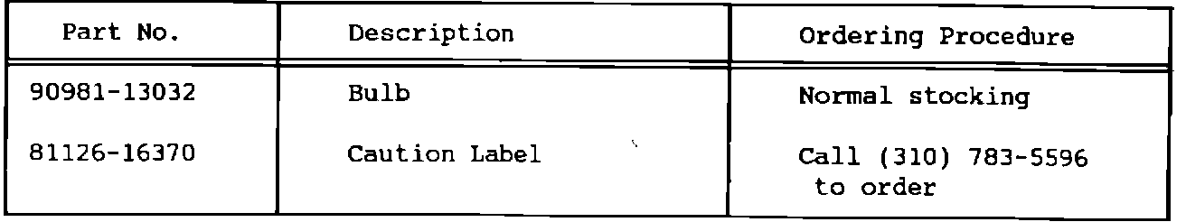 Please assist any involved Tercel owner by inspecting and replacing any non-Koito or burned out headlamp bulb with the correct Koito bulb. If an owner has not installed the caution labels on each headlamp housing, please do so for them. An initial supply of these labels is enclosed with this information package. Should you require additional labels, they can be ordered by calling (310) 783- 5596. In addition, please install caution labels and Koito headlamp bulbs as necessary in any vehicles currently in your stock.