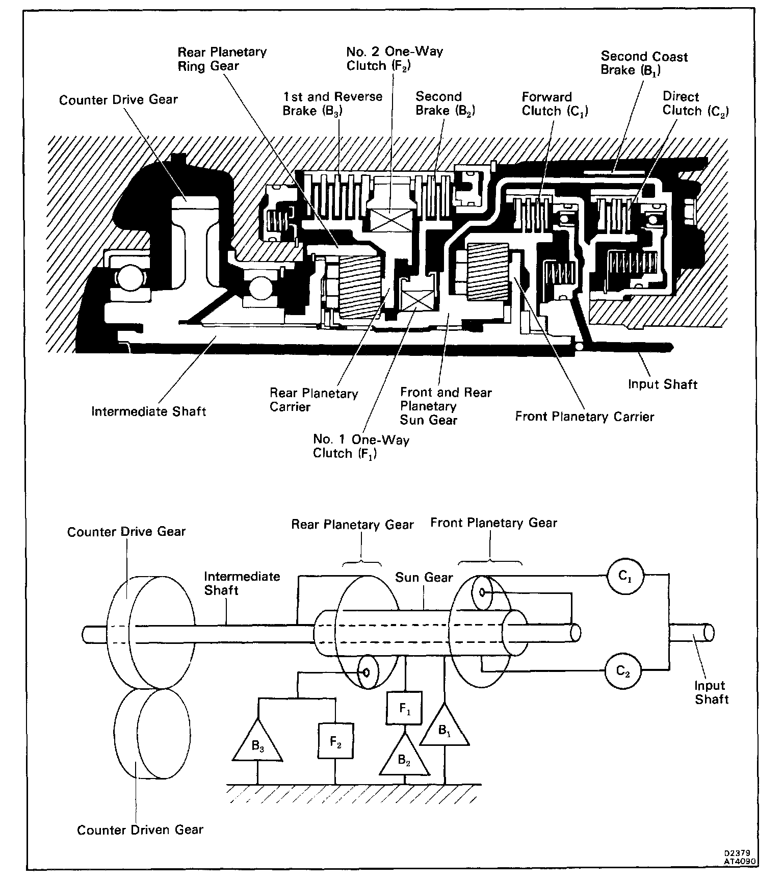 ConstructionThe planetary gear unit is composed of two sets of planetary gears, two clutches which transmit power to the planetary gears, and three brakes and two one-way clutches which immobilize the planetary carrier and planetary sun gear.