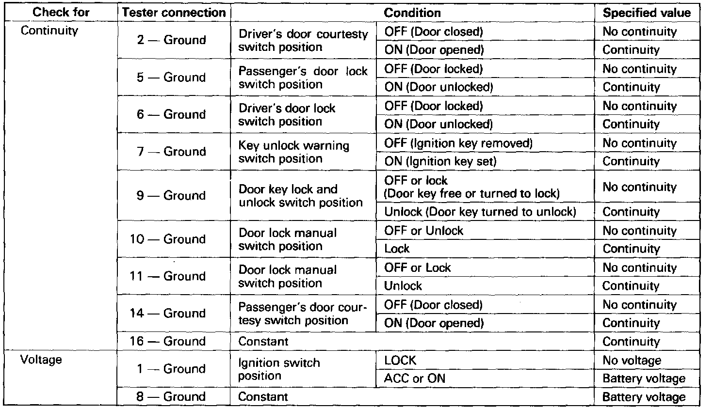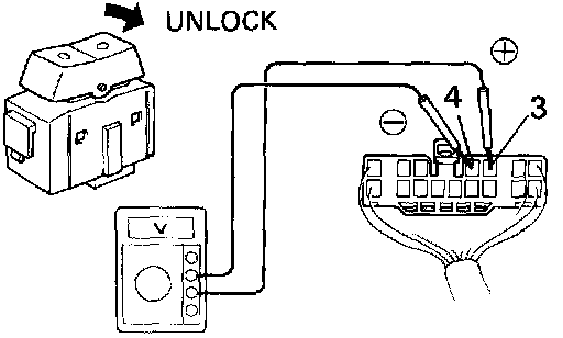 (c) Set the door lock manual switch to UNLOCK, check that the voltage rises from 0 volts to battery voltage for approximately 0.2 seconds.