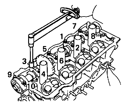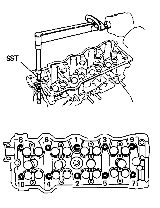 5. Using SST #09043-88010 or equivalent, uniformly tighten the ten head bolts in several passes in the sequence shown.