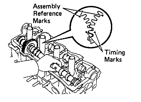 17. Engage the exhaust cam gear to the intake cam gear by matching the timing marks on each gear as shown above.