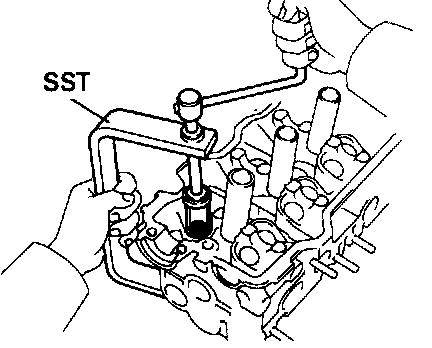(a) Using SST, compress the valve spring and remove the two keepers. SST 09202-70010