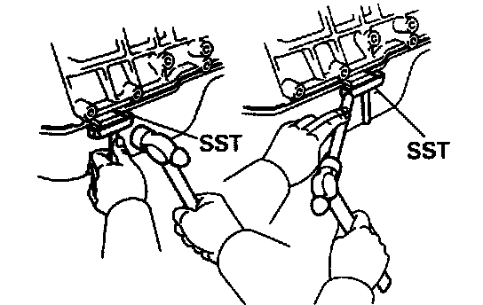 (c) Insert the blade of SST between the cylinder block and oil pan, cut off applied sealer and remove the oil pan.