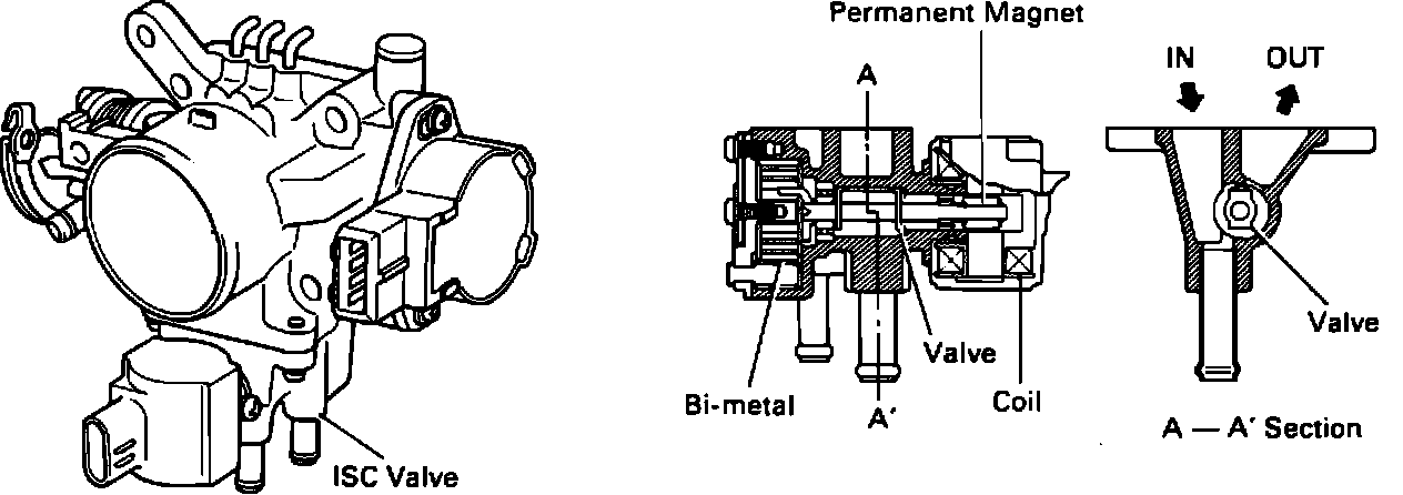 The ECU receives input from various sensors and controls idle speed through the idle speed control valve. The ISC Valve provides an air bypass around the throttle valve with an electric motor that rotates a flap in the air passage. The ISC Valve has battery voltage applied to it and grounds back through the ECU via terminals ISC1 and ISC2. There is a bimetal thermal valve on the end of the ISC Valve that provides high idle at start-up.