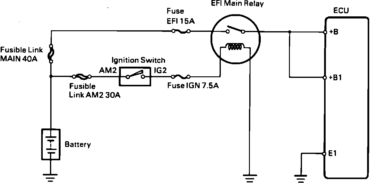 The EFI Main Relay, located in the fuse panel on the LH side of the engine compartment, serves as a source of battery power for several components including the Circuit Opening Relay, (which powers the Fuel Pump), the Fuel Pressure Up VSV and the ECU. The EFI Main Relay is supplied battery current through the EFI fuse and is energized by a signal from the ignition switch. The ECU receives relay input at terminals +B and +B1.