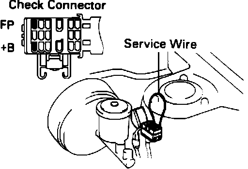 8. Using a service wire, short terminals +B and FP of the engine check connector. This will cause the fuel pump to operate and pressurize the system.