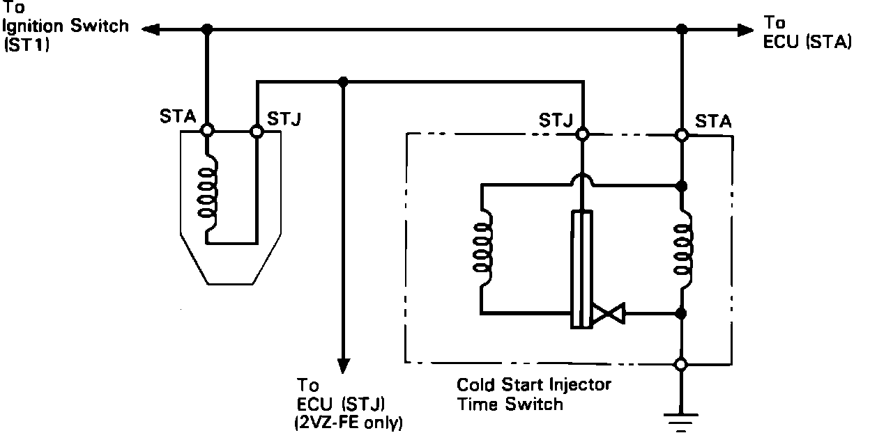 Ground is interrupted in two ways. The first is by engine coolant temperature heating the switch to above its calibrated thermal point. This prevents the Cold Start Injector from injecting fuel on warm engine restarts. The second interuption is by the internal time switch heater. When the starter is cranking, this heater will heat and break the circuit in approximately ten seconds or less to prevent engine flooding, if the engine does not start immediately.