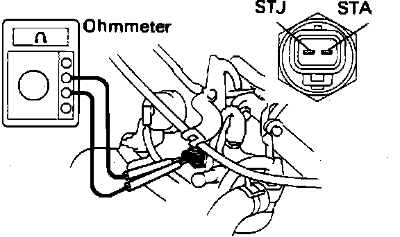 2. Connect a voltmeter to terminal STA on the harness and ground, while an assistant turns the ignition switch to the start position (crank mode).