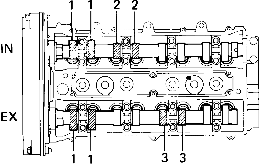 2. Using a suitable feeler gauge, measure clearance between valve lifter and camshaft lobe. Measure valve clearance of valves indicated in Fig. 7.