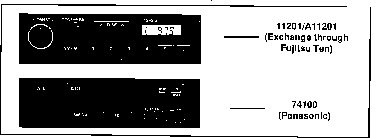 Exchange the 11201 2 speaker ETR through Fujitsu Ten's warranty exchange program. All exchange radios have been countermeasured effective 11/06/91. Countermeasured 11201 radios will have a "black" mark on the volume shaft (remove the volume knob to verify marking).