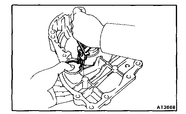 HINT: Press in the two outer races until they touch the snap ring. Tap the races in straight, so that they do not tilt.