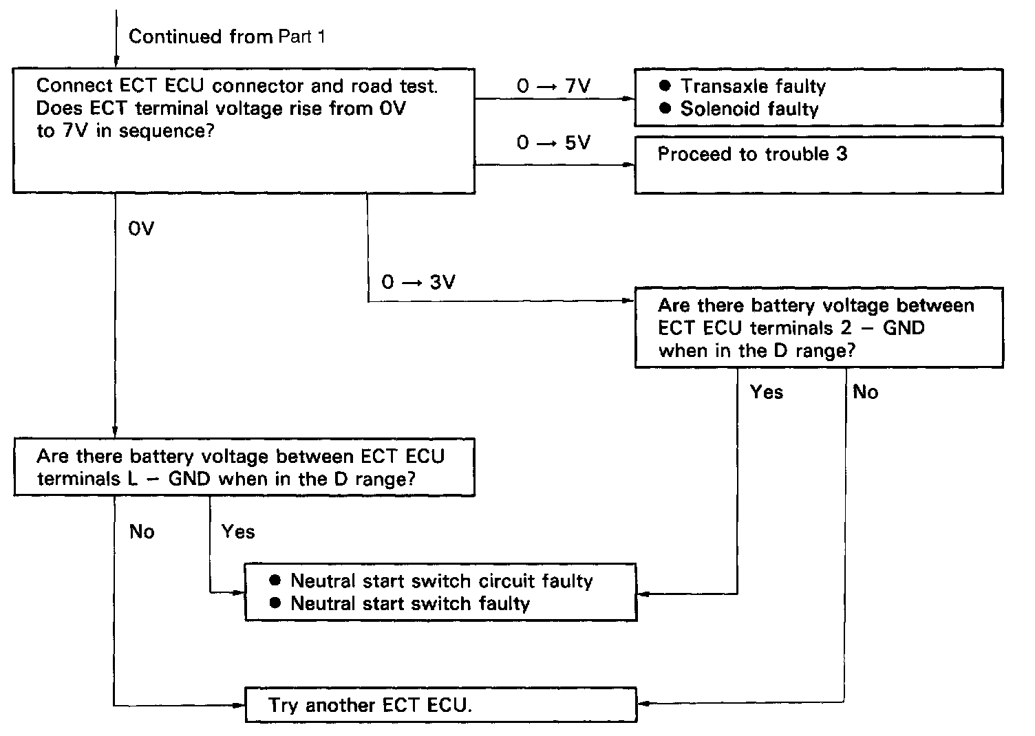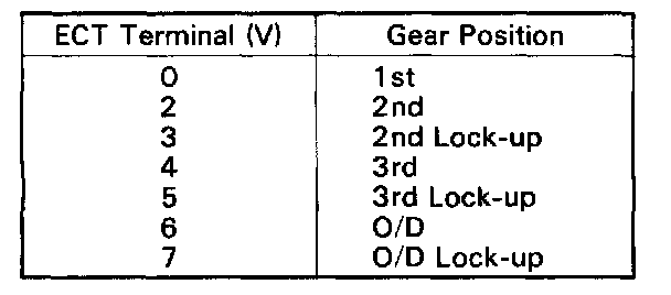 d. During a road test (above 10 km/h or 6 mph) check that voltage at the ECT terminal is as indicated for each up-shift position.