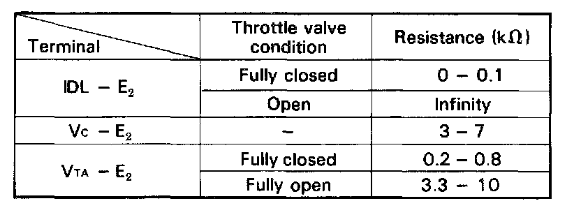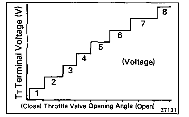 If the voltage does not change in proportion to the throttle opening angle, there is a malfunction in the throttle position sensor or circuit.