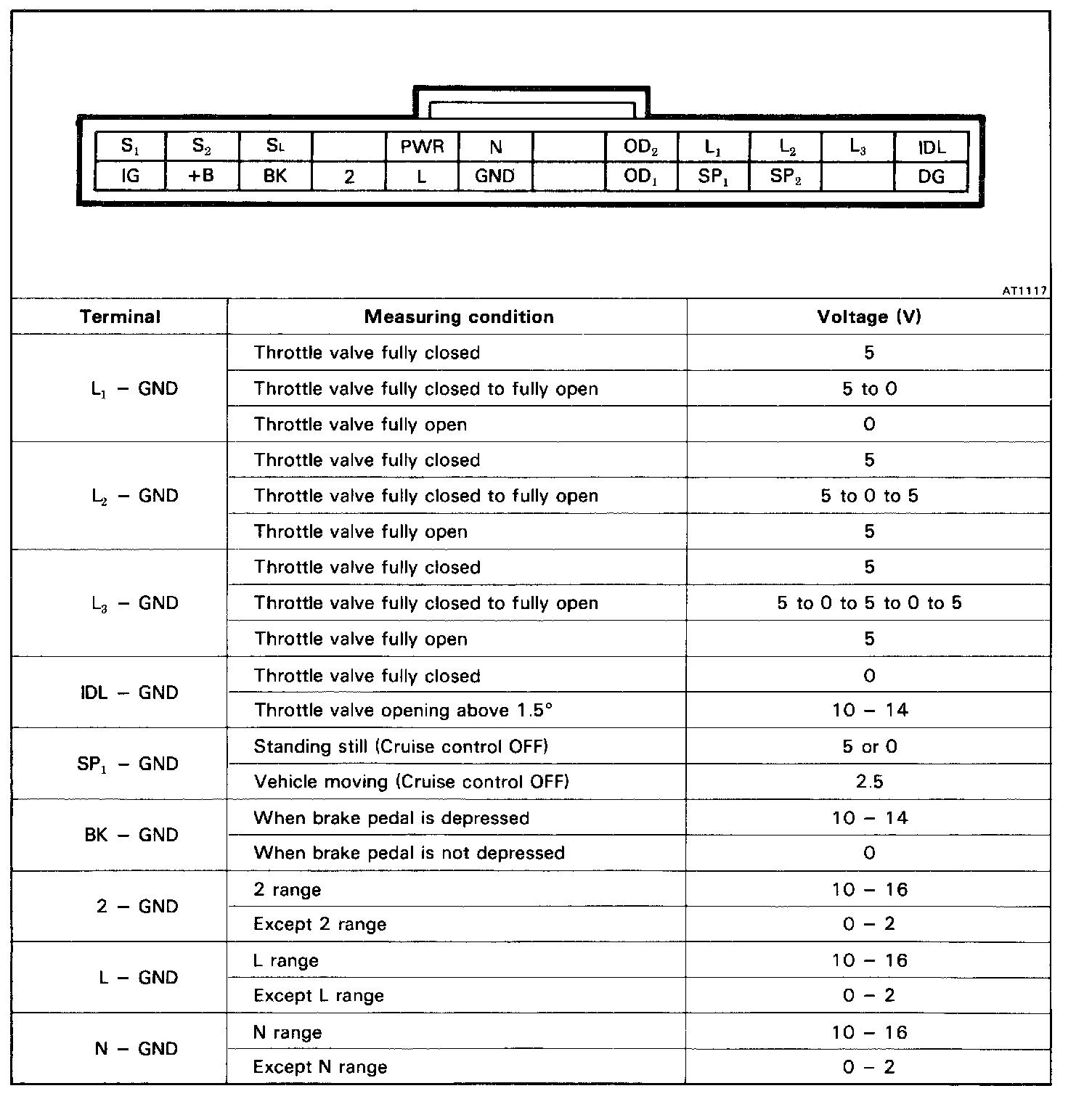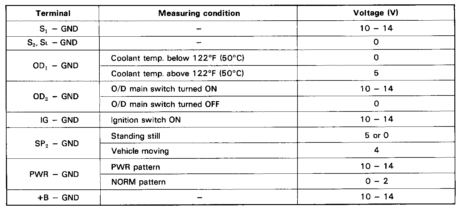 HINT: Determine the gear position by a light shock or change in engine rpm when shifting. The lock-up clutch will turn ON only infrequently during normal 2nd and 3rd gear operation. To trigger this action, press the accelerator pedal to 50% or more of its stroke. At less than 50%, the voltage may change in the sequence 2 V - 4 V - 6 V - 7 V.