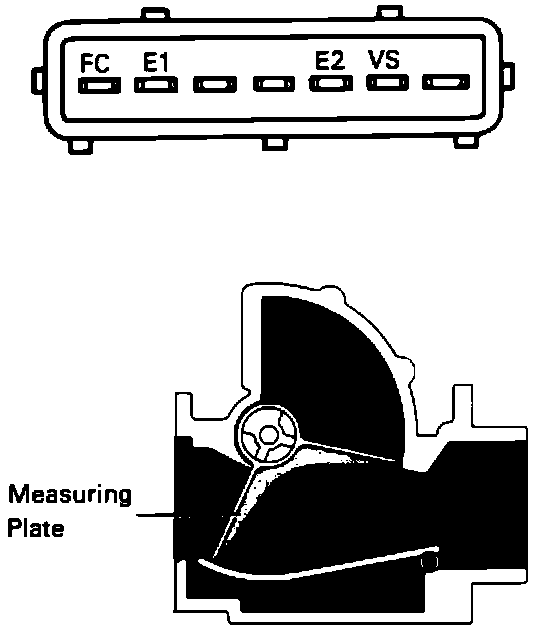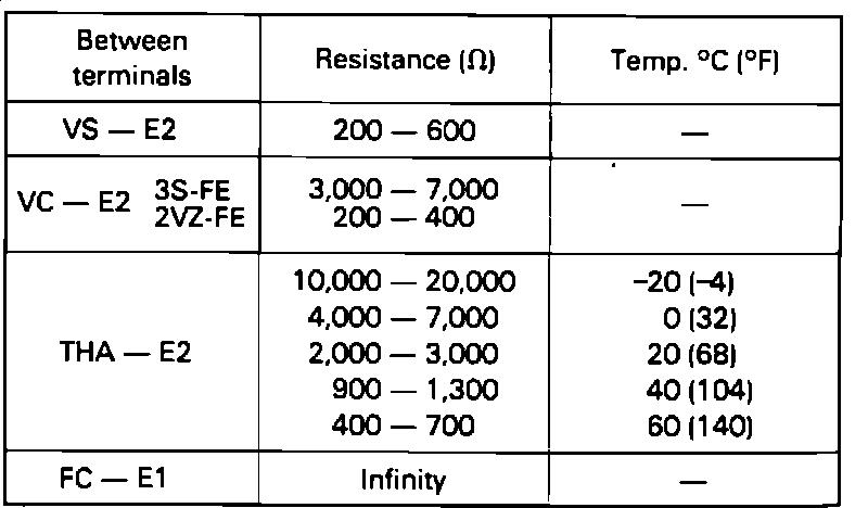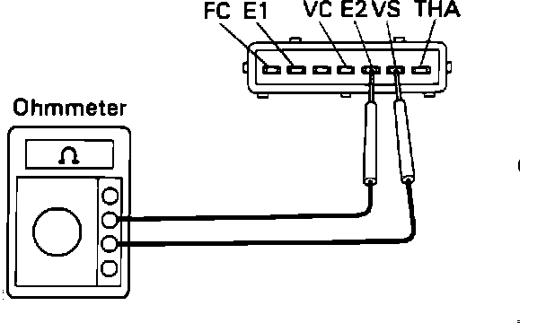 1. Disconnect Air Flow Meter connector.2. Using an Ohmmeter, measure the resistance between each terminal. (Refer to chart)