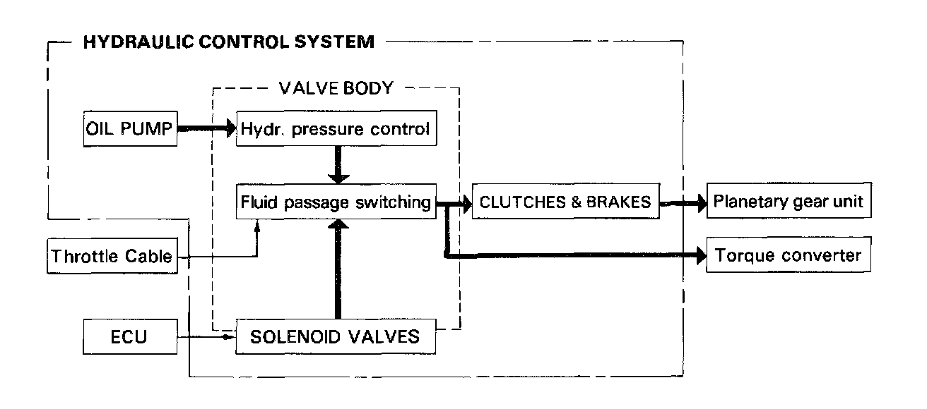 The hydraulic control system is composed of the oil pump, the valve body, the solenoid valves, the accumulators, the clutches and brakes, and the governor valve as well as the fluid passages which connect all of these components.