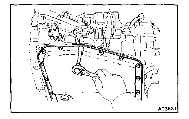 NOTE: Do not turn the transaxle over as this will contaminate the valve body with the foreign materials in the bottom of the oil pan.