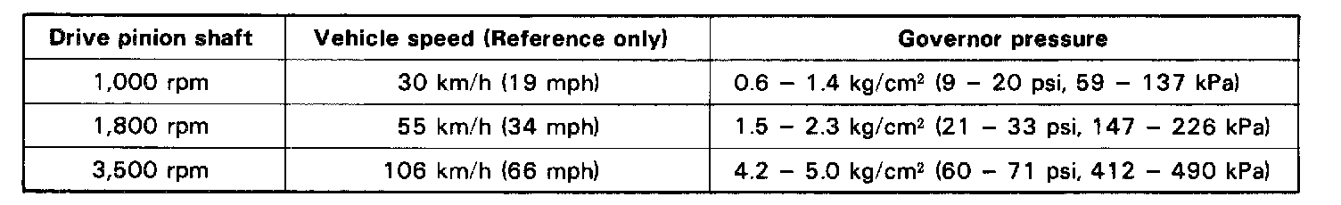 c. Shift into D range and measure the governor pressures at the speeds specified in the table.