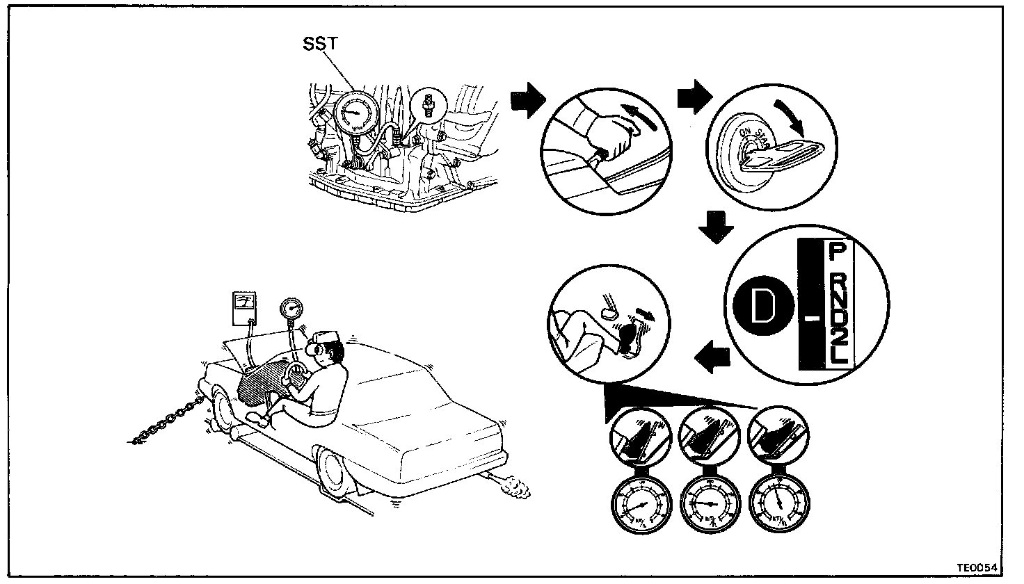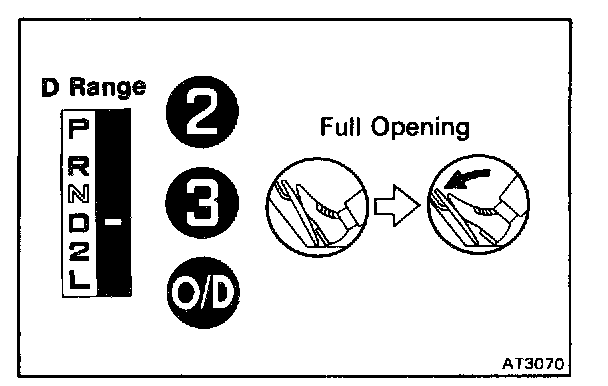 1. Drive in D range, O/D gear, at a steady speed (lock-up ON) of about 70 km/h (43 mph).