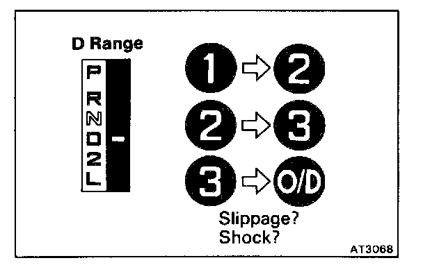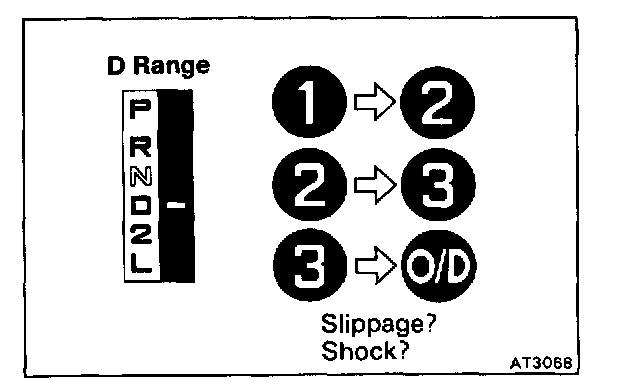 When the shift lever is shifted while the engine is idling, there will be a certain time elapse or lag before the shock can be felt. This is used for checking the condition of the O/D direct clutch, forward clutch, direct clutch and first and reverse brake.