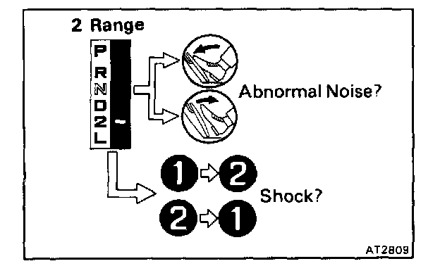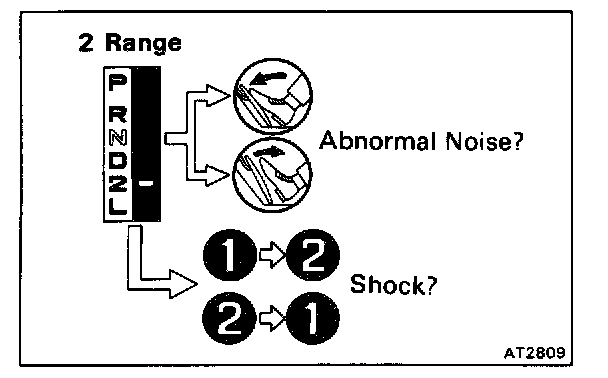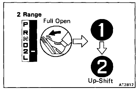 Shift into the 2 range and, while driving with the accelerator pedal held constantly at the full throttle valve opening position, check on the following points.
