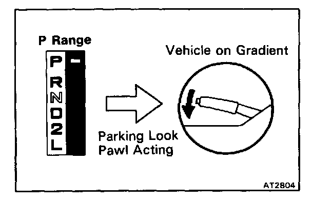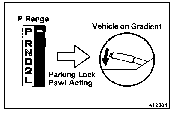 Stop the vehicle on a gradient (more than 50) and after shifting into the P range, release the parking brake. Then check to see that the parking lock pawl holds the vehicle in place.