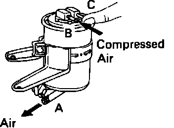 2. Plug pipe (C) with your finger and blow compressed air (43 PSI), through pipe (B) from fuel tank.