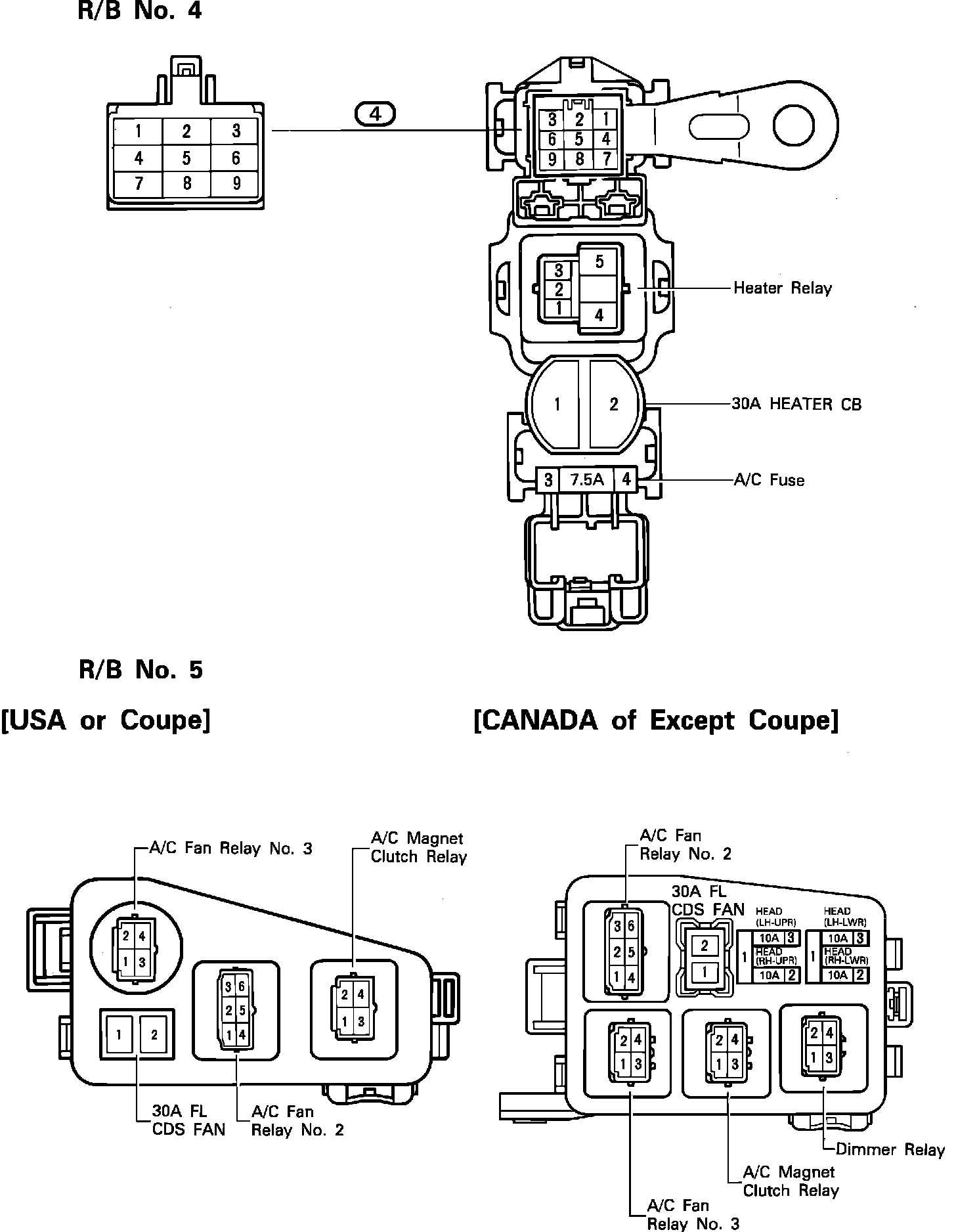 Fuse Panel: Relay Boxes No. 4 (Right Kick Panel) & No. 5 (Engine Compartment Left):