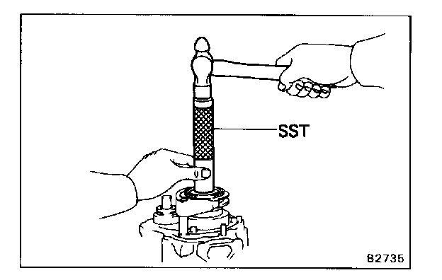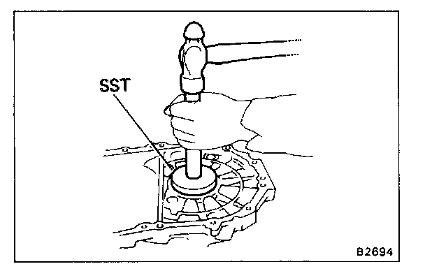 If the preload is not within specification, remove the transmission case side outer race of the side bearing with SST.