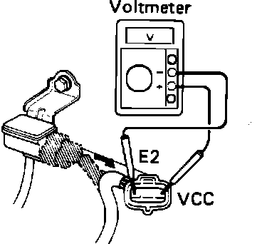 3. Using a voltmeter, measure the voltage between terminals VCC and E2 of the sensor harness connector.