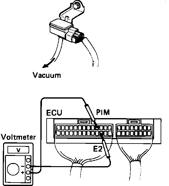7. Connect a voltmeter to terminals PIM and E2 at the ECU and measure the voltage with zero vacuum applied.
