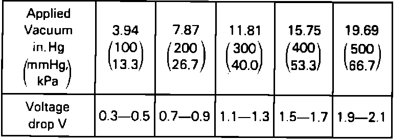 8. Using a handheld vacuum pump, apply vacuum to the MAP Sensor in increments of 3.94 in.Hg. Compare the Voltage Drop Chart to the applied vacuum quantities.