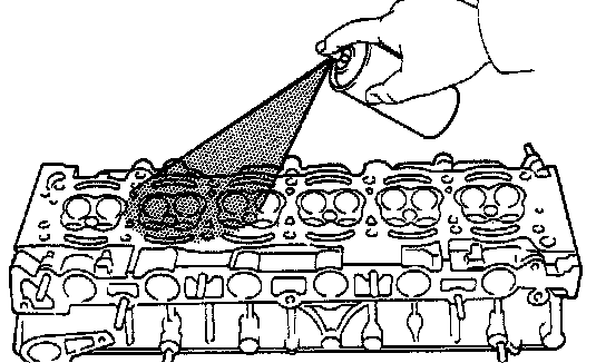 Using a dye penetrant, check the combustion chamber, intake and exhaust ports, head surface and the top of the head for cracks. If cracked, replace the cylinder head.