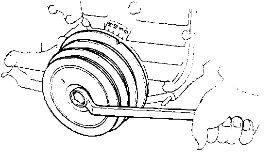 (b) Pry the pulley toward the left as far as it will go and temporarily tighten the bolt.
