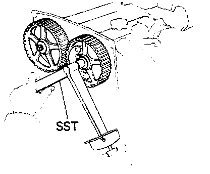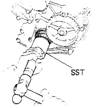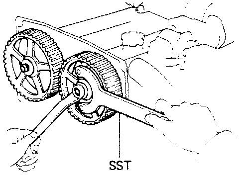 Using SST to hold the pulley, remove the pulley bolt, timing pulley and straight pin.