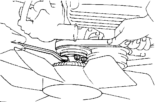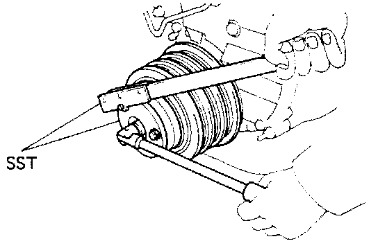 (e) Using SST to hold the pulley, torque the pulley bolt.