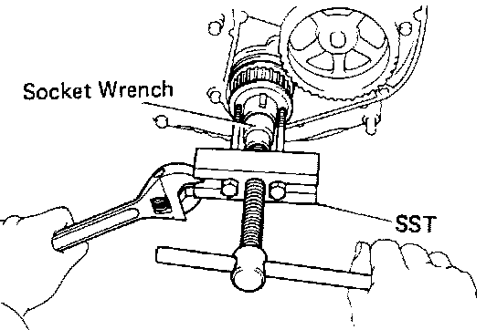 Using SST and a socket wrench, remove the crankshaft timing pulley.