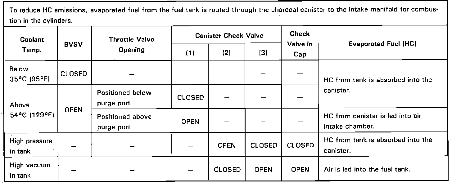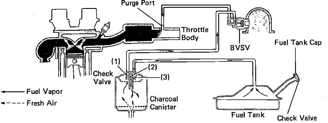 This system is designed to prevent raw fuel vapors from escaping into the atmosphere by the use of a charcoal canister, bi-metal vacuum switching valve (BVSV), purge port at the intake manifold and a vented fuel filler cap. The system holds fuel vapor collected from the fuel tank in the charcoal canister where it is stored until the engine warms to 129° F. The BVSV then opens and allows engine vacuum to draw fuel vapors into the combustion process through a check valve in the canister. When air is drawn through the canister, it opens another check valve in the canister that pulls fresh air through the system. This process in turn, pulls air into the fuel tank through the check valve in the fuel cap.