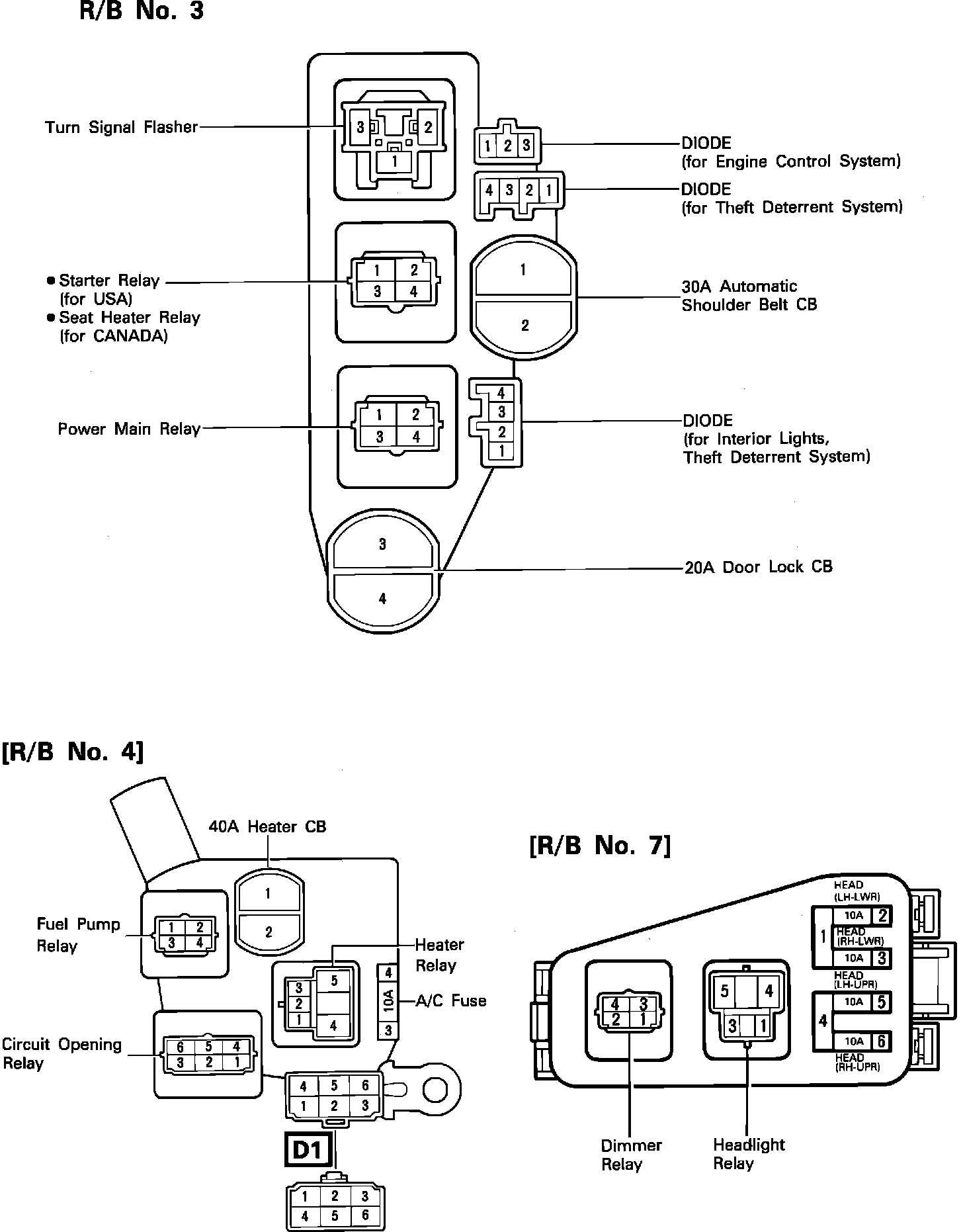 Fuse Panel: Relay Boxes No. 3 (Left Kick Panel), No. 4 (Right Kick Panel) & No. 7 (Engine Compartment Left):