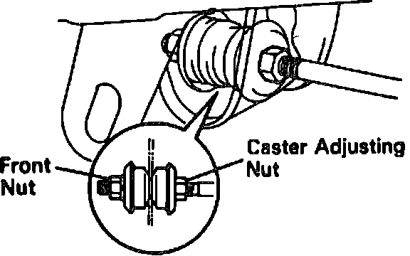 Caster is adjusted by turning caster adjusting nut, Fig. 2. Loosen strut bar front nut and turn camber adjusting nut to adjust. Each revolution of nut alters caster angle 3/10°. Torque strut bar front nut to 83 ft. lbs.